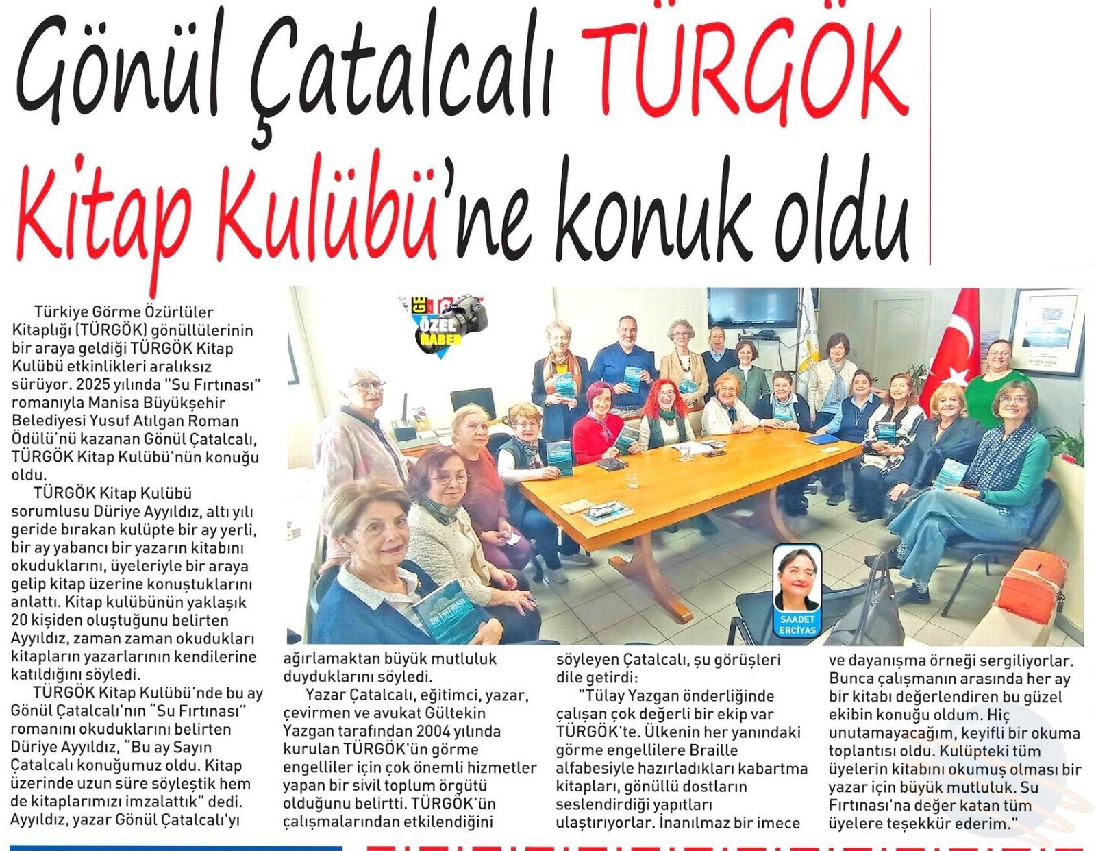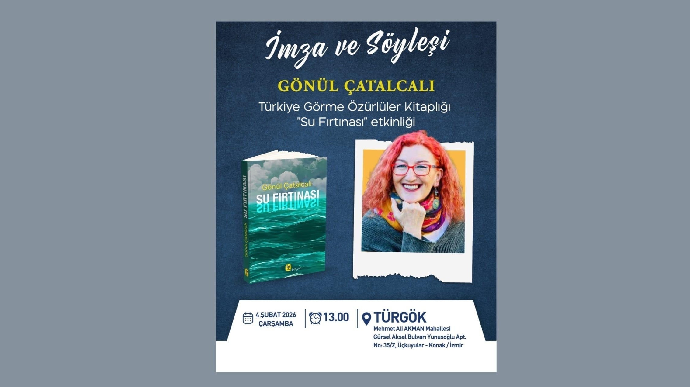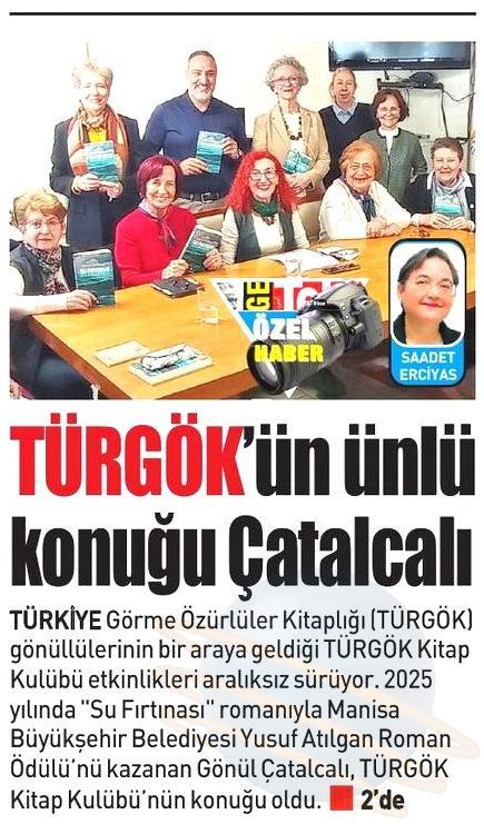 Türkiye Görme Özürlüler Kitaplığı (TÜRGÖK) gönüllülerinin bir araya geldiği TÜRGÖK Kitap Kulübü etkinlikleri aralıksız sürüyor. 2025 yılında “Su Fırtınası” romanıyla Manisa Büyükşehir Belediyesi Yusuf Atılgan Roman Ödülü’nü kazanan Gönül Çatalcalı, TÜRGÖK Kitap Kulübü’nün konuğu oldu.